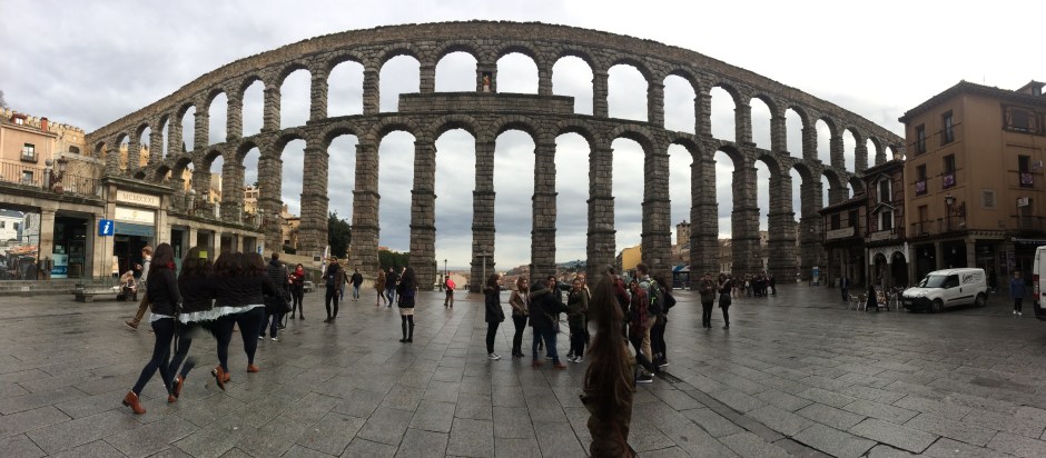 Iphone panorama for the win!! Here in Segovia, is the best preserved work of the Romans! It has 166 arches and was built with just stone, no mortar or anything in between!! It stays together due to the natural tension from the other stones. It has been like this for 2,000 years and was in use until the 1920s!!